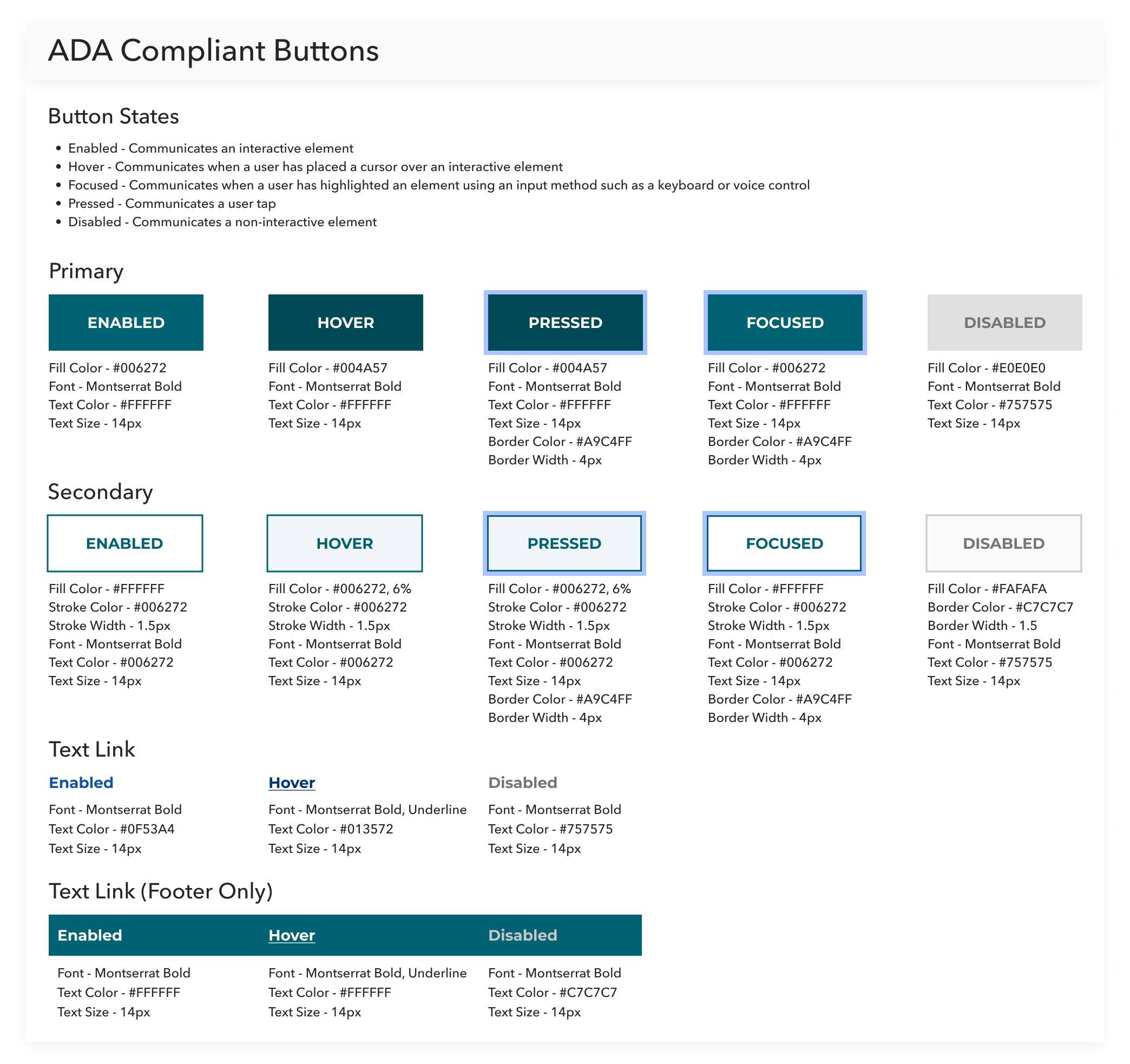 Secondary button text is the primary teal color and is outlined in the primary teal color with an additional .5px thickness